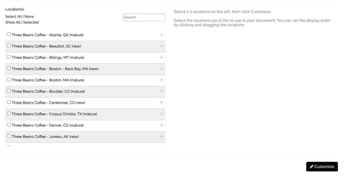 Choose a location by clicking the check box to the left of the location name. The search and sort functions can be used to find locations and to view current selections. Once the locations have been chosen, click the Customize button.