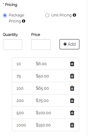 Package pricing allows System Administrators to set up defined quantities of items (10, 25, 50, etc.,) with a specific price.